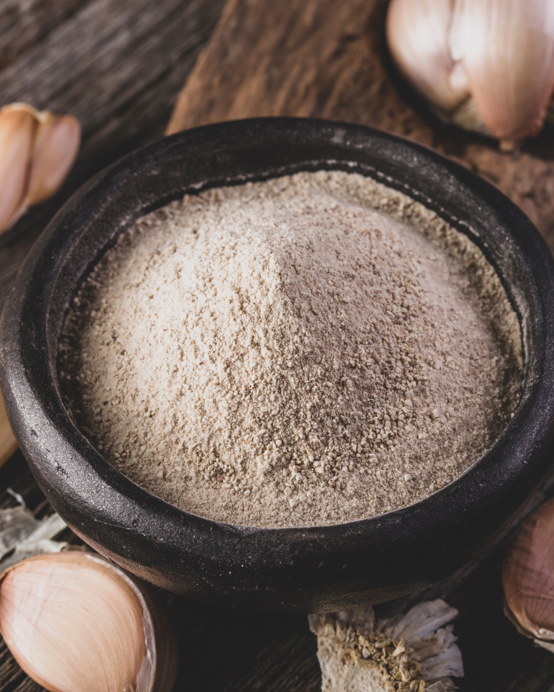 Producido a partir del ajo pelado, cortado y deshidratado. Se emplea para aromatizar una elaboración. El ajo en polvo tiene un sabor más complejo e intenso que el ajo crudo, aunque sin su picor.